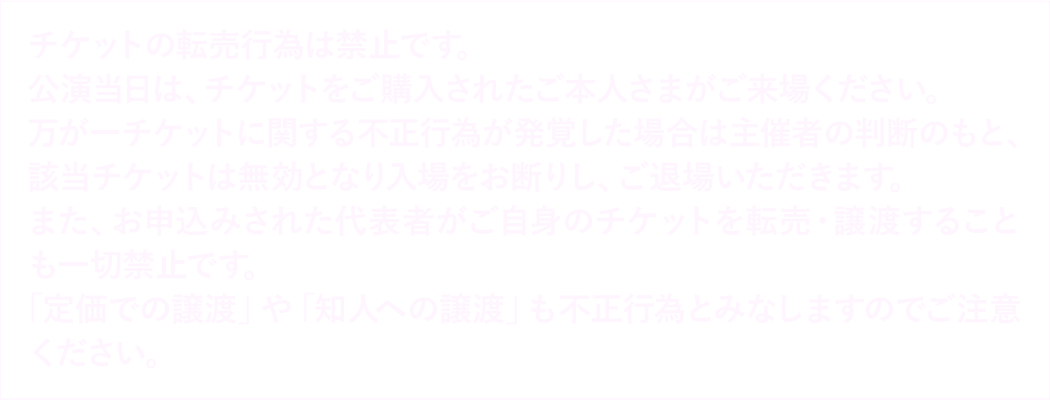 ●公演当日にお客さまのご都合によりご入場できない場合、チケットの払戻しは一切いたしませんので、あらかじめご了承ください。